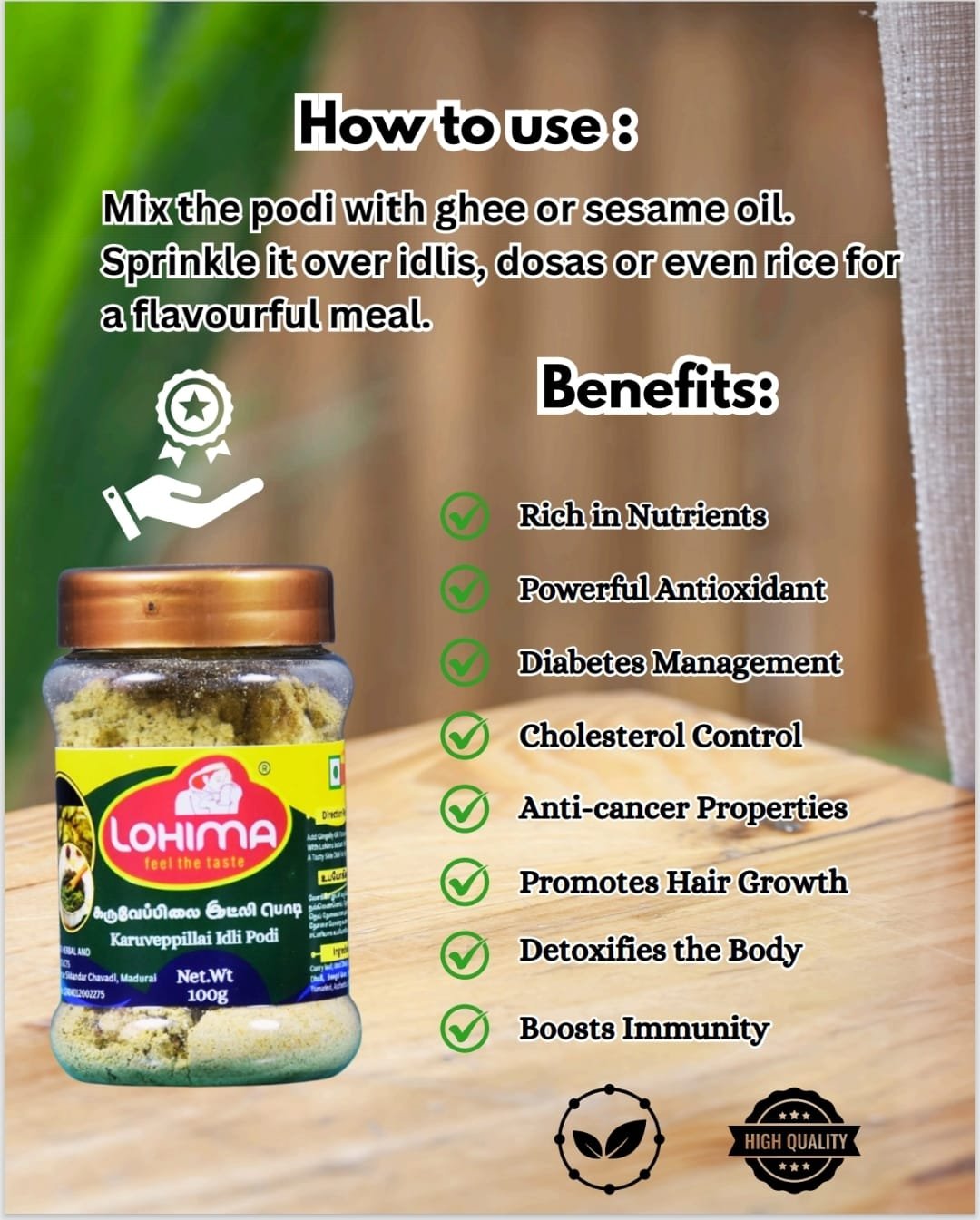 Lohima Ellu Idly podi 100% Natural ingredients, Homemade products. NO preservatives, Colours and Flavors.